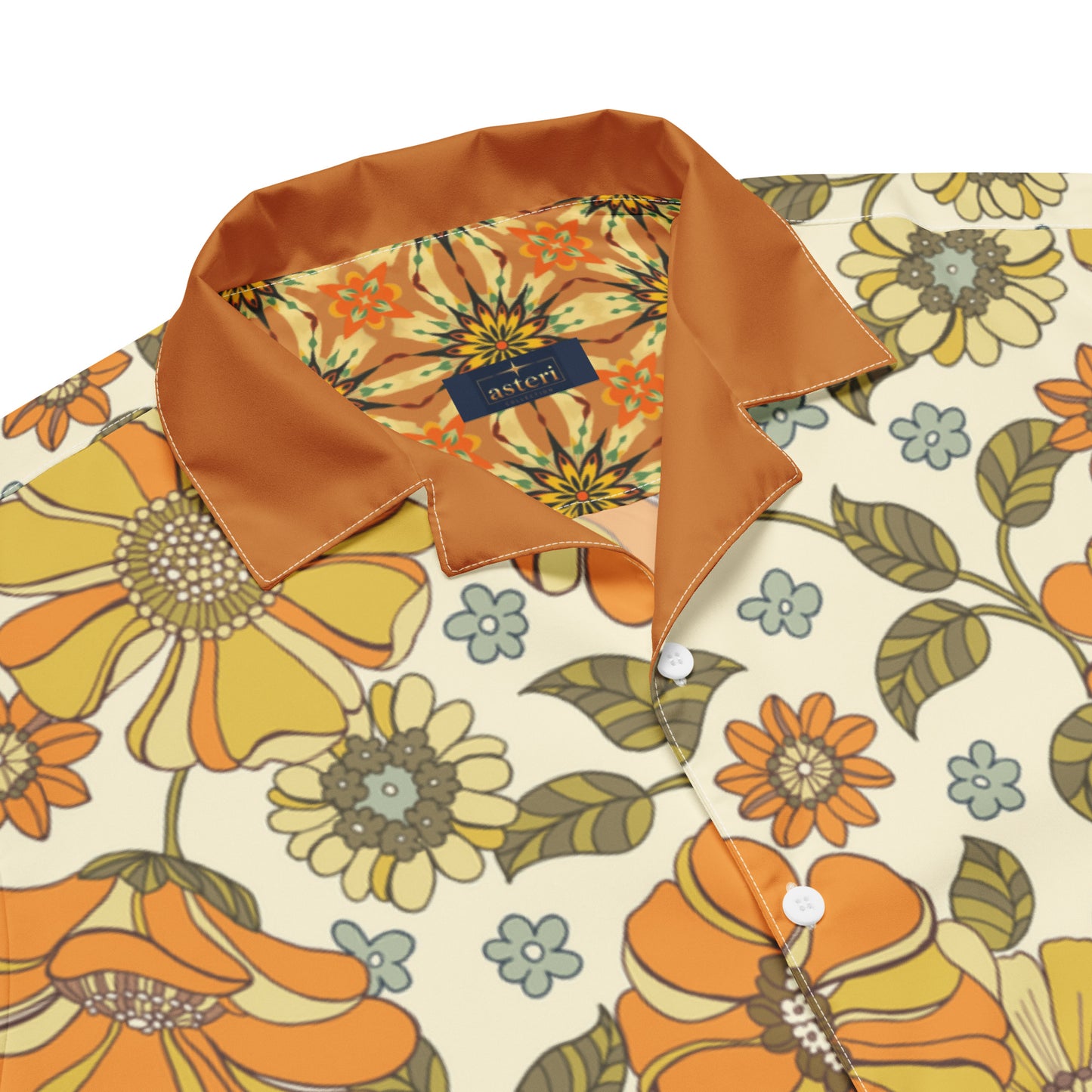 Featuring an all-over floral print in rich burnt oranges, golden ambers, creamy neutrals, and warm retro hues, this shirt is here to prove that flowers aren’t just for vases. The deep orange-gold collar adds a touch of dashing drama, while the yoke pops with a mid-century starburst repeat pattern that says, “Yes, I do know what rakish charm looks like—and I’m wearing it.”