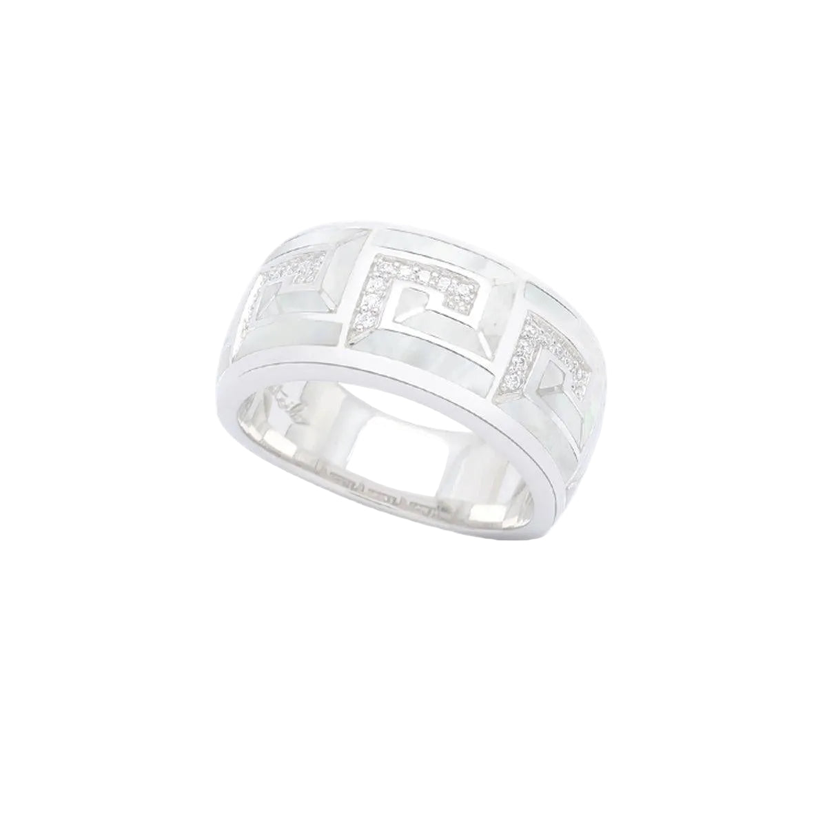 Embrace the timeless design of Greek Key curated by Asteri Collection. This Belle Étoile original take revitalizes the classic pattern of the Greek key. Throughout the years, this design has symbolized infinity, unity, and the eternal flow of life, bringing prosperity and good fortune to all who wear it. Each section features hand-carved mother-of-pearl set in channels of platinum-plated sterling silver and accent stones. Let your creativity and passion flow with Greek Key!
