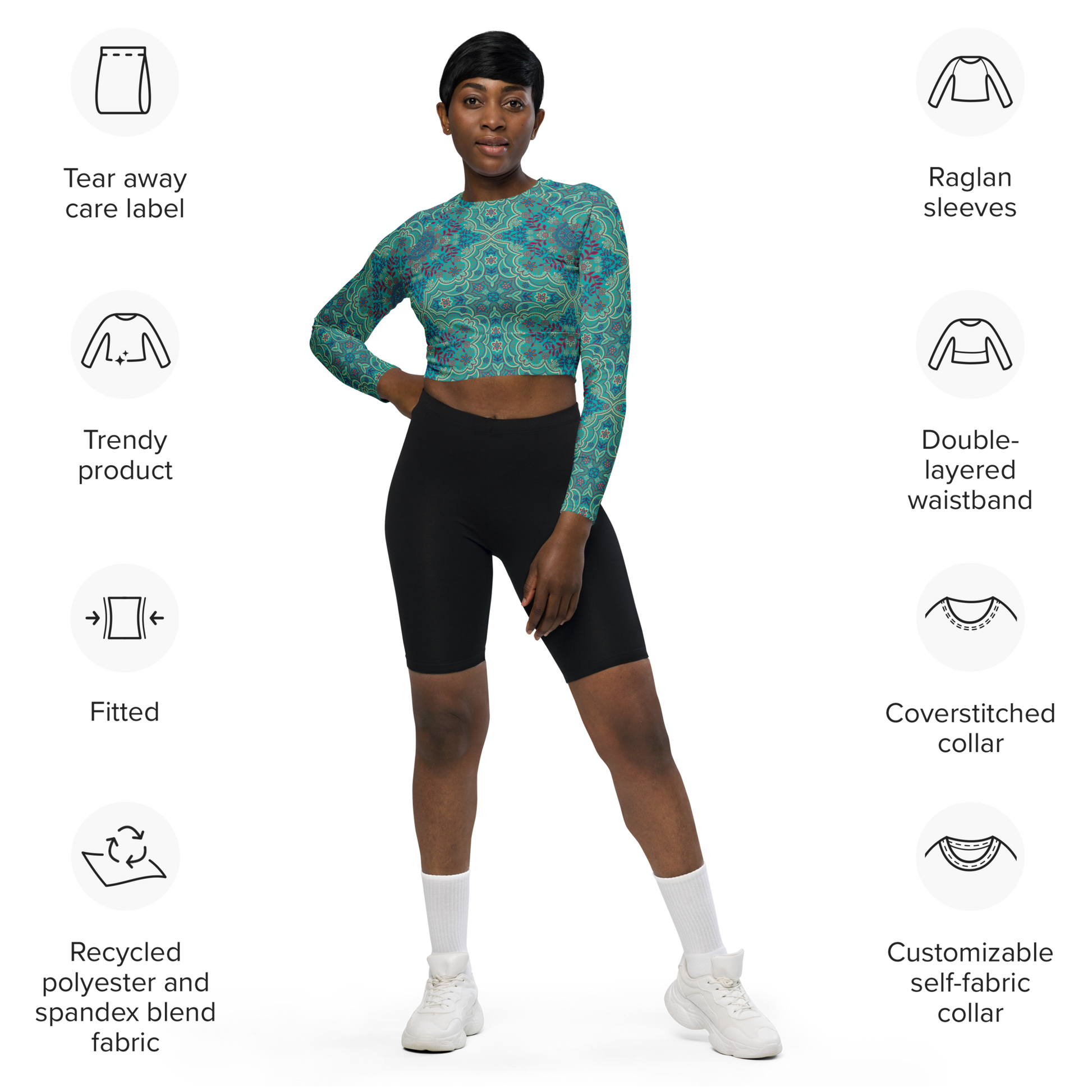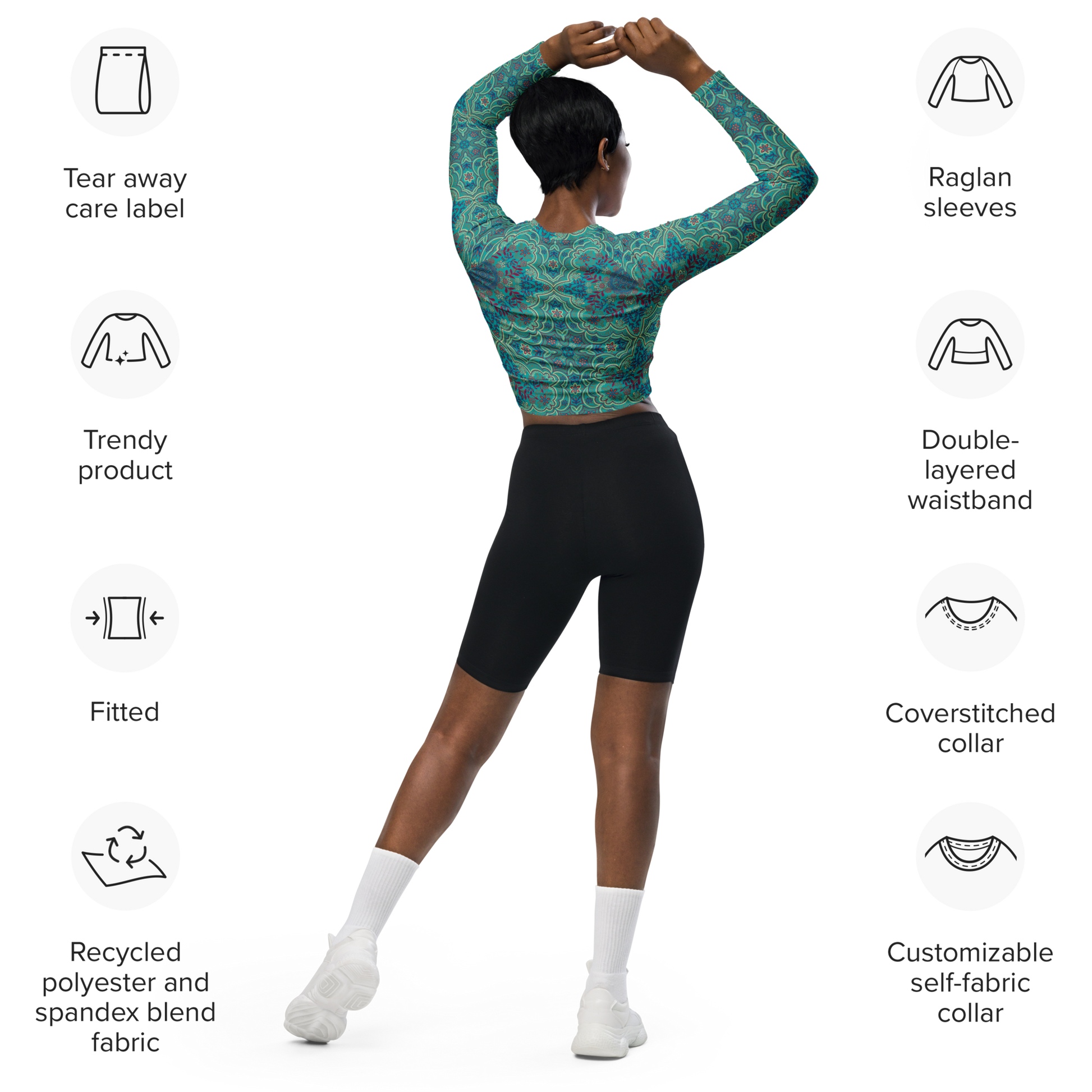This long-sleeve crop top is made of recycled polyester and elastane, making it an eco-friendly choice for swimming, sports, or athleisure outfits. The crop top has a tear-away care label and a wide, double-layered waistline band for a comfortable fit.
